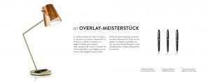La perfetta lampada da scrittura Overlay e lo strumento da scrittura Meisterstück Le Grand sono vendute in combinata in un elegante cofanetto personalizzato. Nella selezione dell’ iconico strumento da scrittura Montblanc, si può scegliere tra le tre versioni roller, stilografica e penna a sfera.