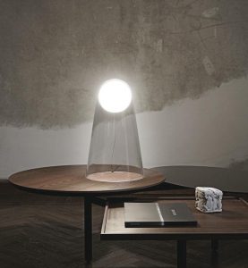 Descrizione : lampada da tavolo con sfera interna in vetro soffiato satinata bianca e campana in vetro soffiato trasparente. Sorgente luminosa a luce Led integrata da 8W – 3000°K – 957lm. con cavo accensione on/off. Misure : H.39cm. diametro 24cm.