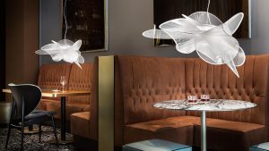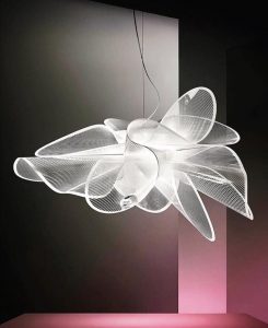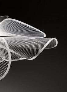 Dinamismo, eleganza e sensualità appartengono al linguaggio quotidiano di La Belle Étoile, la lampada a sospensione ispirata ai volteggi aggraziati di una ballerina, infrangibile, leggera, realizzata interamente a mano nell’atelier di Slamp. Dal dialogo tra tecnologia – la sorgente luminosa a LED è facilmente sostituibile tramite attacco magnetico – e ricerca stilistica – le superfici trasparenti sono arricchite di una texture bianca stampata-, nasce una lampada dal design contemporaneo – disponibile in due dimensioni (diametro 90cm. e diametro 73cm.) – ideale per chi desidera unire funzioni illuminotecniche avanguardistiche ed estetiche raffinate e glamour, che apportano bellezza e originalità anche alle mise in place più minimaliste. Protagonista indiscussa della scultura luminosa è la luce, la cui intensità può variare da 0 a 100 per assecondare completamente i desideri delle persone che la circondano.