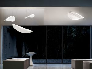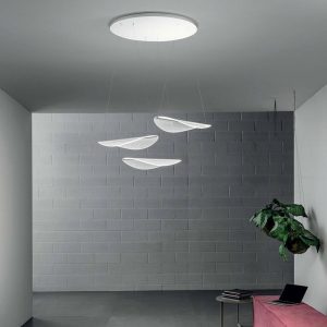 Descrizione : lampada da sospensione singola e composta, lampada da soffitto/plafoniera e lampada da terra, dalla forma caratteristica, una foglia sospesa il cui diffusore in PMMA è interamente ricoperto da una trama di microincisioni al laser che distribuiscono la luce nel piano sottostante e verso l’alto (OptiLight Technology TM). Grazie a questa tecnologia, una volta spenta la lampada, risutla completamente trasparente, mentre da accesa, lascia intravvedere l’elegante pattern puntiforme. La sorgente topLED viene alloggiata all’interno di un’asta centrale in alluminio verniciato bianco. Due cavi fungono sia da sostegno che da conduttori, ricollegandosi ad un rosone bianco di forma ovale. Una lampada di design, disponibile in due misure nella versione lampada da sospensione singola e da soffitto/plafoniera e nelle varianti DALI e Phase-Cut. Sorgente luminosa Led : da 21W 3000°K sospensione singola cm.53,6 – da 40W 3000°K sospensione singola cm.75,6 – da 42W 3000°K sospensione conposta – da 21W 3000°K plafoniera cm.53,6 – da 48W 3000°K plafoniera cm.75,6 – da 30W 3000°K lampada terra. Diphy nella versione plafoniera è adatta anche per installazione come applique da parete. La versione lampada da terra ad arco è grande e molto luminosa. Nuove soluzioni per illuminare ed arredare ogni vostro ambiente di casa o di lavoro.