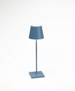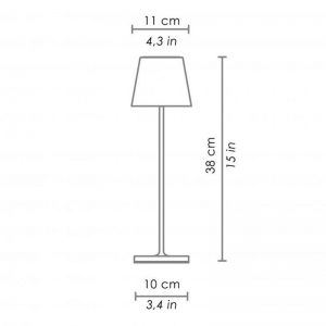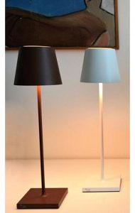 Descrizione : lampada ricaricabile da tavolo, con corpo in alluminio verniciato opaco o metallizzato, diffusore in policarbonato. Fonte luminosa a LED da 2,2W 3000K 154Lm. Accensione e spegnimento con touch. Lampada ricaricabile con durata della batteria garantita per più di 9 ore (batteria al litio inclusa). Poldina ha un grado di protezione IP54 che la rende adatta sia all’uso interno che esterno. Colori disponibili : bianco opaco – corten – foglia oro – foglia argento – foglia rame – arancio – blu avio – rosa – salvia.