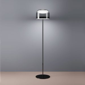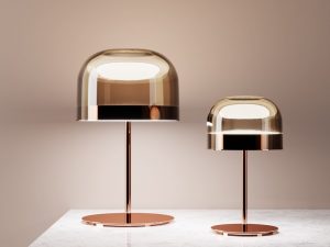 Reinterpretazione in chiave contemporanea delle classiche lampade con paralume in vetro. Se nelle tradizionali abat-jour il diffusore alloggia al suo interno la sorgente luminosa, in questa famiglia di lampade il diffusore è paradossalmente e suggestivamente vuoto e l’effetto luminoso è prodotto da due dischi luminosi all’interno di una fascia metallica centrale, visibile sul paralume e che richiama la linea dell’equatore. La luce prodotta dai Led, grazie a schermi interni disposti a strati, si distribuisce regolarmente sulla superficie dei dischi, irradiandoli magicamente di luce. Il disco inferiore produce un’emissione luminosa verso il basso, quello superiore illumina la calotta di vetro, per una diffusione morbida della luce. Disponibile da tavolo, da terra e da sospensione, in due misure, si declina in due tonalità: una più fredda, in grigio con struttura cromo scuro, e una più calda, con calotta trasparente tortora e struttura color rame.