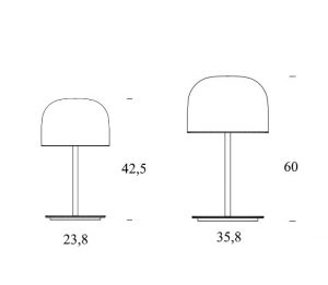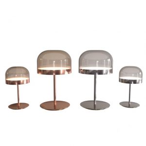 Descrizione : lampada da tavolo e da terra in metallo nichel nero o rame con diffusore vetro soffiato. Lampada da tavolo disponibile : H.42,5mm. D.23,8mm. led da 25W 2700K – H.60cm. D.35,8mm. led 40W 2700K dimmer incluso. Lampada da terra disponibile : H.135cm. D.26,7mm. led 25W 2700K – H.175cm. D.37,1mm. led 40W 2700K dimmer incluso.