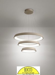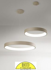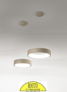 Descrizione : sospensioni e plafoniere con struttura in alluminio verniciato colore sabbia finitura satinata. Luce led integrata e montata verso l’interno del diffusore circolare. Questi apparecchi da illuminazione, sono dotati di led ad alta efficienza luminosa, con temperatura colore 3200K schermati da un diffusore in PMMA. La lunghezza dei cavi è regolabile, max H.120cm. Disponibili in diverse misure diametro : d.1080cm. – d.80cm. – d.60cm. – d.45cm. ( disponibili anche nella versione colore bianco )