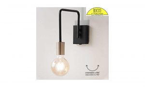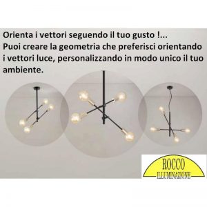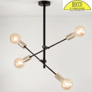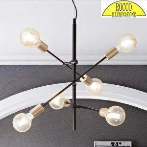 Descrizione : sospensione, plafoniera, lampada da parete e da tavolo in metallo verniciato a polvere colore nero con portalampada in finitura ottone invecchiato. Sospensione disponibile : da 6 luci d.54cm. H.150cm. con cavo regolabile in altezza e vettori-braccio luce orientabili – da 4 luci d.42cm. H.150cm. con cavo regolabile in altezza e vettori- braccio luce orientabili. Le sospensioni sono con attacco a lampadina E27 compatibile per lampadina led. Plafoniera disponibile a 4 luci d.42cm. H.75cm. con vettori-braccio luce orientabili, attacco E27 compatibile per lampadina led. Lampada da parete a 1 luce H.43cm. Sp.24cm., con braccio luce orientabile 180°, attacco E27 compatibile per lampadina led. Lampada da tavolo 1 luce H.42cm. L.17cm., attacco lampadina E27 con pulsante on/off.