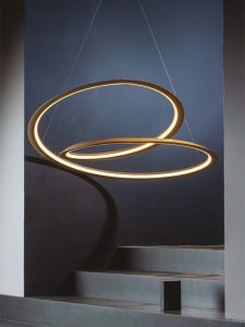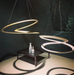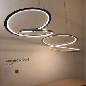 Descrizione : sospensione con struttura e rosone in estruso d’alluminio verniciata a polveri, disponibile nella nuova finitura GOLD opaco, bianco opaco e nero opaco. La linea continua è realizzata attraverso un processo di lavorazione tridimensionale dell’estruso di alluminio, disegnata sulla base del principio geometrico del nastro di Moebius. Versioni disponibili : uplight (luce diffusa verso l’alto) e down light (luce diffusa verso il basso) ; versione Kepler Minor sospensione con diametro da 84cm. Led 77W – 2700K/3000K dimmerabile e Kepler sospensione con diametro 110cm. Led 65W – 2700K/3000K dimmerabile.