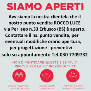 Avvisiamo la nostra clientela, che il nostro punto vendita ROCCO LUCE via Per Iseo n.33 Erbusco (BS) è APERTO. Contattare il nostro punto vendita per eventuali modifiche orario di apertura, per progettazione – preventivi solo su appuntamento tel. 030 7709732 / e-mail: info@roccoilluminazione.it Avvisiamo inoltre la nostra clientela, che per raggiungere il nostro punto vendita, basta compilare l’autocertificazione con motivazione spostamento per ” bene di prima necessità ” inserendo l’indirizzo del nostro punto vendita. ( l’illuminazione rientra nella categoria di negozi, che possono stare aperti anche in zona rossa, essendo un bene di prima necessità ) Per ulteriori informazioni, contattare il nostro ufficio commerciale tel. 030 725148. VI aspettiamo….
