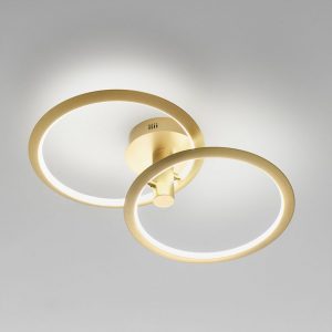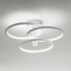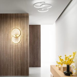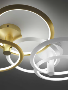 Nuova linea di lampade da illuminazione, da soffitto – plafoniera e da parete – applique, disponibile in finitura bianco satinato – oro spazzolato – nero satinato. Struttura in alluminio e diffusore luce in silicone bianco opale. Sorgente luminosa a Led, dimmerabile tramite dimmer esterno, non incluso. Lampada a due cerchi, led da 40w 2000Lm. 3000k misure : diametro cm.40,5x66cm. H. 19cm. Lampada a tre cerchi, led 60w 3000Lm. 3000k misure : diametro cm.60x65cm. H. 24cm. Caratterizzata da una silhouette all’apparenza semplice, ma espressiva che ben si adatta ai più diversi contesti, dagli ambienti domestici a quelli di ambito commerciale. Design dinamico e vivace per un arredamento in stile contemporaneo. Design, qualità, Made in Italy.