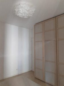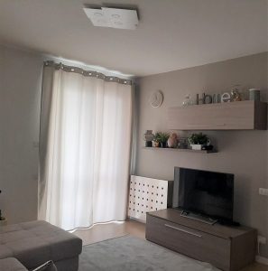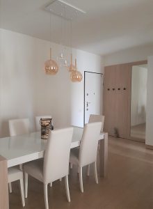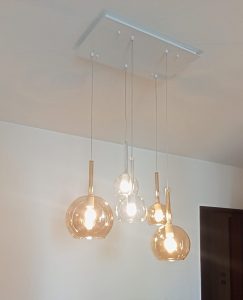 Ambientazione casa privata. Illuminazione zona soggiorno – tavolo composizione formata da 5 sospensioni ( 1 vetro diam. 25cm. + 1 vetro diam. 20cm. + 3 vetri diam. 15cm. ) in vetro pirex soffiato in finitura colore ambra e trasparente, rosone da soffitto a piastra multiluci L.60x35cm. in finitura bianca. Montature sospensioni in finitura bianca, cavo trasparente, attacco E27 – E14 per lampdine a Led. Zona salotto, lampada da soffitto – plafoniera in metallo finitura bianca L. 50x46cm. con attacco lampadina n.4xGX53 Led 9w 3000k. Zona camera, lampada da soffitto – plafoniera modello Veli Large Couture white, diametro 78cm., attacco lampadina n.3xE27 lampadine Led. Illuminazione dal design contemporano, Made in Italy.