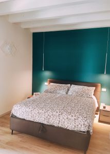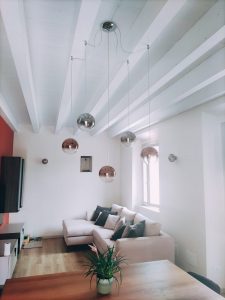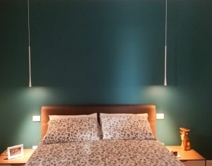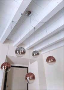 Ambientazione casa privata. Illuminazione zona tavolo, composizione con cinque sospensioni a sfera diametro 15cm. in vetro pirex soffiato in finitura cromo/trasparente e finitura rame/trasparente, rosone e volute per decentramento sospensioni in finitura cromo lucido. Attacco lampadina G9 led da 7w 3000k. Zona salotto, lampada da parete a sfera diametro 15cm. in vetro pirex soffiato in finitura rame/trasparente, montatura in cromo lucido, attacco lampadina G9 led 7w 3000k. Zona camera, lampada da parete doppia cornice in finitura bianca L.45x45cm. led integrato da 39w 3000k. Zona comodini, sospensioni in metallo finitura bianca con led integrato da 7w 3000k. Illuminazione dal design contemporano, Made in Italy.