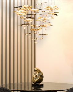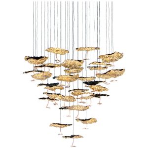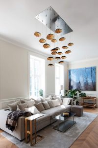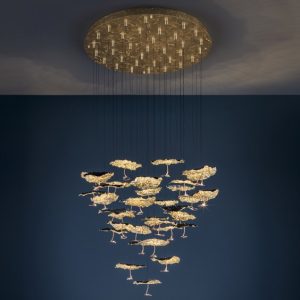 Gold Moon Chandelier è una sorprendente composizione di luci da soffitto prodotta dal brand Catellani&Smith. Gold Moon è una lampada a sospensione che sa creare ambienti caldi, ti avvolge con la sua luce dorata e riesce a decorare ogni tipo di ambientazione. E’ realizzata con una base a soffitto in acciaio satinato, schermi luce in finitura nero/foglia oro, ricciolo in rame, jack nickel e cavi neri. Illuminazione a Led intercambiabile da 1w 24v 2700k per ogni elemento luminoso, dimmerabile IGBT/Triac. Disponibile in composizione da 20 luci led – 25 luci led – 30 luci led (su richiesta disponibile personalizzazione con rosone a piastra rettangolare). Misure : base – rosone soffitto diametro 78cm. – diffusore luce diametro 20cm. – H. 300cm. (cavi non tagliabili). Disponibile inoltre anche la versione a singolo pendente con rosone o con jack di fissaggio per soffitto in cartongesso, ideale per realizzare composizioni personalizzate. Gold Monn Chandelier semplicemente una scultura di luce. Design, qualità e produzione artigianale, esclusivamnte Made in Italy.