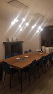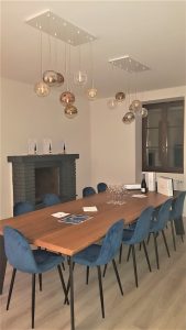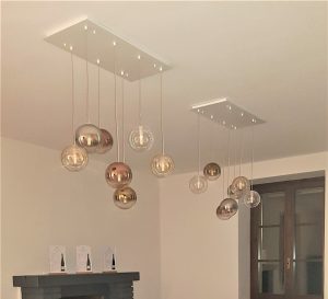 Ambientazione…. Azienda vinicola Savoldi, zona sala degustazione, installazione di due composizioni con sette sospensioni a sfera diametro 15cm. in vetro pirex soffiato in finitura ambra – fumè – trasparente – oro – rame. Rosone a piastra misure L.75x35cm. finitura bianca. Sospensioni con attacco lampadina G9 led da 7w 3000k. Illuminazione dal design contemporano, Made in Italy.