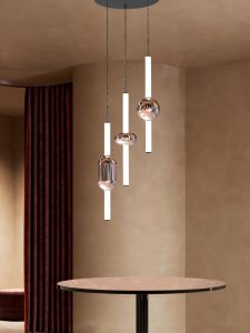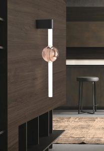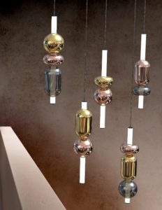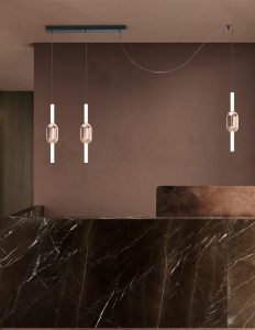 Nuova collezione di illuminazione a Led, sospensioni singole e a composizione, lampada da parete e lampada da tavolo. Descrizione : montatura in metallo colore nero – diffusore luce in vetro opale + elementi decorativi di varie forme e colori : vetro ambra – vetro fumè – vetro rame pieno – vetro oro pieno – metallo ottone spazzolato. Sospensioni disponibili nelle varianti : singola – composizione con rosone tondo da 3 o 5 elementi luce – su binario a 3 elementi luce – sospensone lineare singola o a composizione. Illuminazione a led integrato da 20w 3000k per ogni elemento luce a sospensione – lampada da parete led integrato da 20w 3000k – lampada da tavolo led integrato da 16w 3000k. Tra design e arte, evoca una prodigiosa scultura luminosa contemporanea, una fluttuante presenza scenica di grandissimo impatto. Domina lo spazio con la sua presenza e diffonde una luce morbida e confortevole, gli elementi decorativi in vetro soffiato e metallo di dimensioni diverse permettono di scatenare la fantasia in composizioni infinite e sempre uniche. Molto di più di una lampada a sospensione è il risultato di uno studio accurato sull’accostamento dei volumi e sulla diffusione luminosa omogenea, finalizzato ad ottenere un insieme equilibrato che gioca sulla disposizione asimmetrica delle parti. Ideale per illuminare ogni ambiente di casa o di lavoro. Design, qualità esclusivamente Made in Italy.