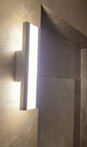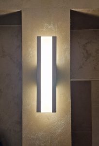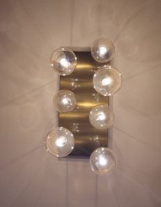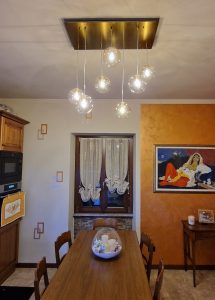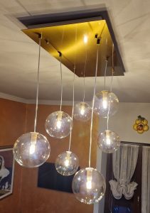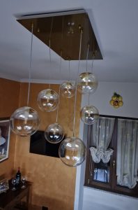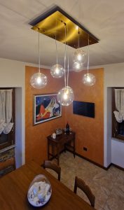 Ambientazione casa privata. Illuminazione zona cucina : composizione da sette sospensioni a sfera diametro 15cm. in vetro pirex soffiato colore ambra. Rosone a piastra rettangolare L. 75x35cm. in finitura ottone satinato. Sospensioni con attacco lampadina G9 Led 4w 3000k. Illuminazione zona bagno : lampada da parete L. 40cm. H. 10cm. Sp. 6cm. a led integrato da 22w 3000/4000k in finitura colore foglia argento. Illuminazione dal design contemporano, Made in Italy.