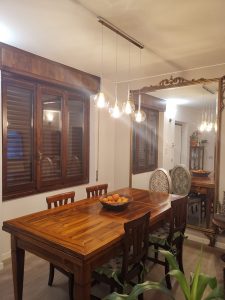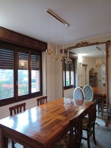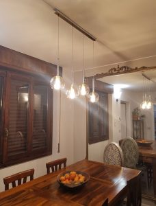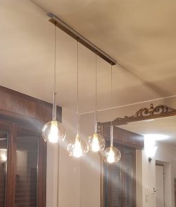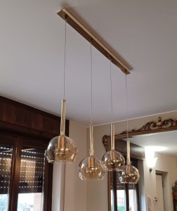 Ambientazione casa privata. Illuminazione zona soggiorno – tavolo, composizione formata da 4 sospensioni dal diametro di 15cm. in vetro pirex soffiato, finitura colore ambra. Rosone da soffitto a binario multiluci, musure L. 80x4cm. in finitura ottone satinato. Montatura sospensioni in finitura ottone satinato, cavo trasparente, attacco E27 per lampdine a Led. Illuminazione dal design contemporano, che si accosta perfettamente ad un arredamento in stile classico. Design, qualità Made in Italy.
