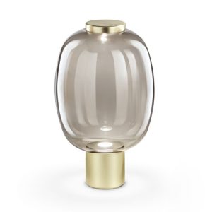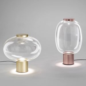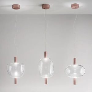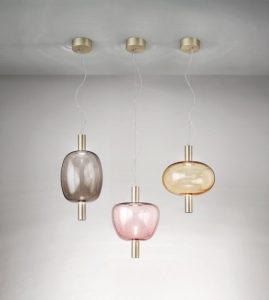Collezione Riflesso, sospensioni e lampade da tavolo, in vetro di murano disponibile nelle varianti colore vetro : cristallo trasparente – ambra trasparente – fumè trasparente – ametista chiara. Struttura in metallo disponibile nelle finiture oro satinato e rame satinato. Sorgente luminosa a led da 12,5w 3000k nelle sospensioni e led da 10,5w 3000k nelle lampade da tavolo. La sorgente luminosa led attraversa una bolla di vetro per rinfrangersi su uno specchio in un gioco di continui rimbalzi. Il vetro non è solo diffusore bensì tramite, quasi invisibile, tra la fonte di luce e l’elemento riflettente. Le silhouette del diffusore vengono esaltate dalla sorgente luminosa a led. La semplicità e la leggerezza del vetro diventano protagoniste in tre diverse forme sinuose, le sospensioni presentate assieme o singolarmente caratterizzano l’ambiente con eleganza. La lampada da tavolo ambientata diventa un oggetto di grande arredo. La collezione Riflesso è di produzione e manifattura artigianle, qualità e design esclusivamente Italiana.