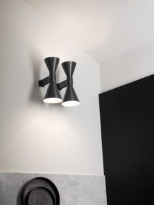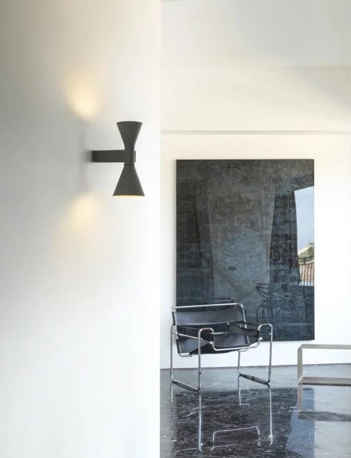 Novità mod. Applique De Marseille Mini. Versione mini della iconica Applique de Marseille – Nemo, progettata da Le Corbusier per il suo appartamento parigino. Lampada da parete in alluminio, composta da due paralumi a forma di cono che dirigono la luce sia verso l’alto che verso il basso, creando fasci di luce nitidi e omogenei. Base e braccio minimal dalle linee esenziali. Dodata di due portalampade con attacco E14, compatibile per lampadine Led, per una doppia un’emissione luce diretta. Finiture colori disponibili in alluminio verniciato grigio opaco, bianco calce o nero, interno diffusori in colore bianco. Dal design molto particolare che richiama lo stile vintage, questa particolarissima lampada si inserisce perfettamente in qualunque arredo, dal classico al moderno, all’attuale stile contemporaneo. Ideale per ogni ambiente di casa o di lavoro. Design, qualità esclusivamente Made in Italy.