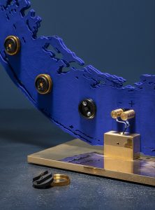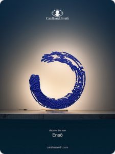Novità Euroluce 2023 mod. Ensò Led table lamp Catellani & Smith. Lampada da tavolo con base e dettagli in ottone, struttura in metallo, superficie esterna irregolare verniciata a mano di colore blu. Fonte luminosa, 11 led da 1W scheda led 24V, potenza nominale 11W 1749lumen 2700k CRI >90, plug driver con dimmer su cavo. Misure : H. 66cm. – base 25x15cm. Le origini : “Ho avuto la fortuna di passare un periodo della mia vita in Giappone. Lì partecipai ad alcune lezioni di calligrafia ed è stata una scoperta nella scoperta. Ancora oggi continuo ad esercitarmi in quell’arte, cercando di trovare in quei gesti lenti e precisi la loro essenza. L’Ensō, il simbolo del cerchio, mi ha affascinato in particolare per ciò che rappresenta, l’illuminazione, la completezza, il tutto, il niente. A quel punto cercare di dare tridimensionalità a quel gesto è stato per me un passaggio naturale”. Enzo Catellani.
