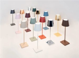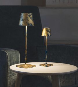Nuove preziose finiture e nuovo colore, arricchiscono la gamma di lampade senza fili Poldina e Podina Micro, nei colori oro craquelé e nero opaco. La finitura craquelé è realizzata tramite l’applicazione manuale di una foglia metallica color oro, questa lavorazione imita un disegno di screpolature superficiali, che rivelano il colore di fondo creando un gradevole contrasto cromatico e di texture. La finitura craquelé di Poldina e Poldina Micro è disponibile su fondo nero, rosso e blu. Se il nero è il colore dell’eleganza e del mistero, allora la nuova versione “total black” di Poldina e Poldina Micro è la variante più sofisticata dell’iconica lampada best-seller. Estremamente versatile, si inserisce in ogni ambiente con stile discreto ma deciso, evocando classe e raffinatezza senza tempo. Come le altre lampade portatili e ricaricabili già di serie, queste nuove versioni sono in alluminio pressofuso; si accendono, spengono e regolano con un tocco; si ricaricano con l’apposita base a contatto; permettono di scegliere la temperatura di colore della luce a LED tra 2200K, 2700K e 3000K. La versione di Poldina in colore nero opaco è adatta all’uso esterno grazie all’alto indice di protezione IP65, mentre la versione con finitura craquelé con foglia color oro sono adatte per uso interno. Una lampada portatile ti regala la libertà di illuminare ovunque tu voglia…. Design, qualità Made in Italy.