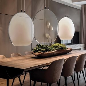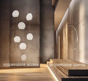 La nuova collezione “Ciondolo” Led ci regala dei magnifici cerchi di luce, perfetti per creare un’illuminazione d’atmosfera elegante e leggera. Diffusore in policarbonato trasparente, lavorato con una speciale tecnica di incisione laser che crea sulla superficie una texture a puntini. La luce interna illumina questa texture generando un effetto di diffusione unico, con delicati aloni che si irradiano verso l’esterno. L’illuminazione è omogenea e soffusa, un vero e proprio cerchio luminoso che sembra librarsi nell’aria. Disponibile nelle seguenti versioni : sincola con diametro 50cm. led 19,2w – 70cm. led 26,4w – 90cm. led 36w, versione a composizione con 7 pendenti led 67,2w. Quando le lampade sono spente, non ostruiscono la vista, quando vengono accese si sprigiona la loro magia!! Forme semplici e minimali, ma dal design ricercato che saprà dare carattere e atmosfera con la sua luce leggera, ad ogni stile d’arredamento. Linee pulite ed essenziali che si integrano splendidamente in qualsiasi ambiente. Design, qualità esclusivamente Made in Italy