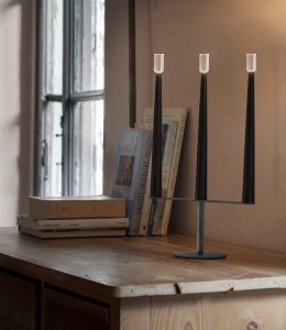 Sorrento è la nuovissima lampada da tavolo portatile e ricaricabile del brand Nemo Lighting. Un oggetto che supera i limiti della percezione, trasportando l’archetipo del candelabro nel presente. Una base in metallo sorregge tre steli slanciati in alluminio, i diffusori in metacrilato trasparente evocano visivamente la fiamma di una candela e illuminano indirettamente il piano. Dimmerabile in tre fasi e con autonomia fino a 15 ore. Led integrato total power 5,4w dimmerabile. Diponibile in finitura colore, Black con base grey e White con base gray. Sorrento dal design contemporaneo è una lampada, che oltre a portare la luce ovunque si voglia, da spenta diventa un oggetto d’arredo. Design, qualità Made in Italy.