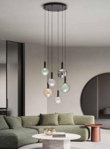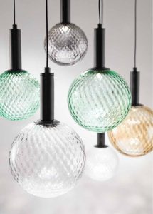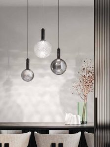 Nuova collezione di sospensioni a Led integrato, disponibile nella versione singola, con rosone tondo da 3 e 6 luci, con rosone rettangolare da 6 luci. Sfera in vetro soffiato con decorazione Balloton, nel diametro da 13cm. e da 18cm. nelle colorazioni vetro : trasparente – verde – ambra – fumè. Struttura completa di elemento luminoso a Led da 12w , rosone e montatura in metallo verniciato nero mat, cavi neri regolabili. Su ogni sistema di illuminazione, sia nella versione singola o con rosone di più elementi luce è posibile avvitare liberamente entrambe le misure delle sfere in vetro, alternandole e creando composizioni personalizzate. Design contemporaneo, ideale per illuminare ed arredare ogni ambientazione di casa o di lavoro. Design, qualità Made in Italy a minor prezzo !!..