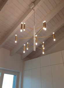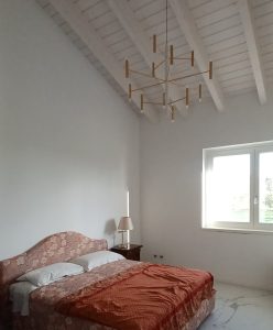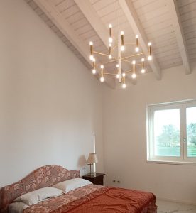 Ambientazione in casa privata, zona camera matrimoniale, installazione lampadario chandelier 12 luci a Led integrato da 53w 3000k 5644 lumen. , finitura bianco/oro spazzolato, diffusori luce in finitura bianco satinato, diametro 100cm. H.75cm. + cavo/rosone. Disponibile nella versione on/off e dimmerabile. Diffusione luce uniforme e diffusa. Disponibile nelle finiture : struttura centrale nero o bianco raggrinzante, mentre bracci e aste terminali sono disponibili nelle finiture oro spazzolato o nichel spazzolato. Dal design contemporaneo, lampadario chandelier nella finitura bianco/oro, espreme al meglio la propria eleganza in arredamenti dallo stile classico. Ideale per ogni ambientazione e stili d’arredamento. Design, qualità esclusivamente Made in Italy.