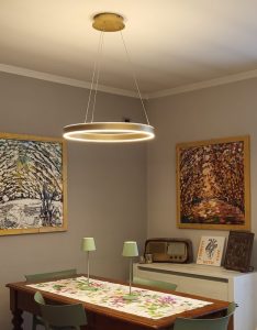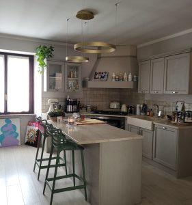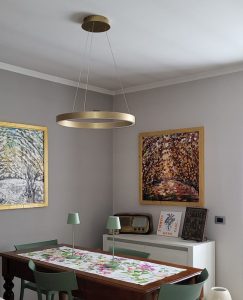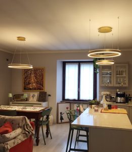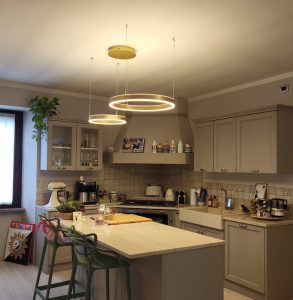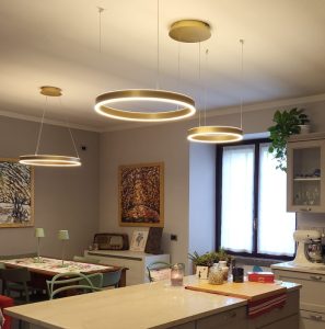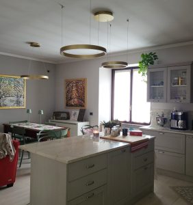 Ambientazione in casa privata, zona penisola cucina ; composizione doppia sospensione a led integrato, composta dalla sospensione del diametro da 40cm. con led da 40w + sospensione del diametro da 60cm. con led da 60w , in alluminio nella finitura oro spazzolato e diffusore in silicone bianco opale. Diffusione luce a biemissione (verso l’alto e verso il basso) led 3000k 5100lm. (dimmerabile a taglio di fase con dimmer esterno + puch) Zona tavolo, sospensione singola del diametro di 60cm. led integrato da 60w, in alluminio nella finitura oro spazzolato e diffusore in silicone bianco opale. Diffusione luce a biemissione, led 3000k 3100lm. (dimmerabile a taglio di fase con dimmer esterno + puch) Illuminazione dal design moderno – contemporaneo che si accosta perfettamente in ambientazione dallo stile più tradizionale – classico. Design, qualità Made in Italy.