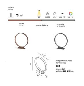 Novità per l’illuminazione da esterno, lampada da terra a Led integrato da 5w 4000k 425lm. disponibile nella finitura corten e finitura antracite. Struttura in alluminio IP54, diffusore luce in vetro, diffusione luce 120°, driver incluso. Dimensioni lampada : diametro 40cm. H. 43,5mm. larghezza 9cm. L’illuminazione da esterno assume un design più innovativo – moderno, ideale per illuminare la zona giardino o una terrazza, nella finitura corte si accosta perfettamente anche a contesti più classici – rustici, dando un tocco di modernità. Design, qualità a mino prezzo !!…