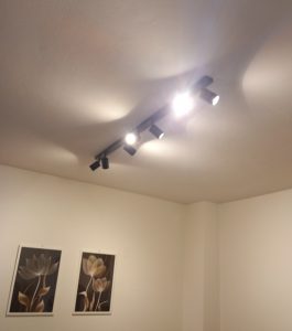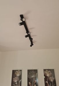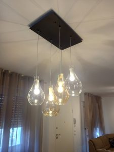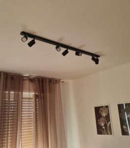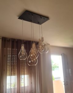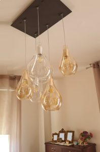 Ambientazione casa privata, zona tavolo composizione con piastra-rosone in metallo rettangolare nella misura 60x35cm. in finitura black, sospensioni in vetro pirex soffiato nel diametro di 21cm. e nel diametro di 16cm. in finitura vetro ambra e vetro trasparente. (disponibile rosone/montature e vetri in altre finiture colori e vetri in vari diametri). Attacco per lampadine E27 led 8w 3000k. Zona salotto, binario in metallo nella finitura black con faretti orientabili, attacco per lampadine 7xGU10 led 7w 38° 3000k. (disponibile anche nella finitura colore bianco e sabbia, da 3 luci e 5 luci). Design contemporaneo che si colloca perfettamente in ogni stile d’arredamento, dal moderno allo stile più classico. Ideali per arredare ed illuminare ogni ambientazione di casa. Design, qualità Made in Italy