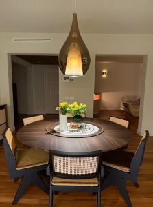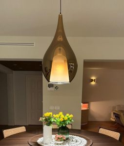 Ambientazione casa privata, zona tavolo sospensione mod. Zoe xxl in vetro soffiato finitura bronzo metalizzato, vetro interno finitura satinata, particolari metallici in cromo lucido, rosone in nero opaco, cavo nero. Diffusione luce tramita attacco lampadina Led 1xE27. ( Sospensione disponibile in varie finiture colore vetro, con effetto specchiato/metallizzato o con colorazione semplice, la parte interna del vetro è sempre in vetro satinato. Misure disponibili : diametro 16cm. – 22cm. – 30cm. e mod. Max da 45cm. Particolari metellici e rosone disponibili in varie finiture colore. Disponibile inoltre, nella versione singola o a composizione con più luci, anche in versione custum personalizzata ) La collezione Zoe possiede un forte valore estetico, grazie alla qualità del vetro soffiato, al design elegante e alle varie finiture cromatiche, consentono di creare combinazioni straordinarie. Zoe dal design semplice ed iconico, ma allo stesso tempo elegante e senza tempo, saprà valorizzare ogni ambientazione di casa o di lavoro. Design, qualità esclusuvamente Made in Italy ditta Cangini & Tucci.