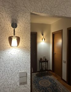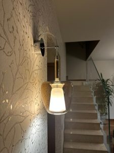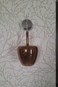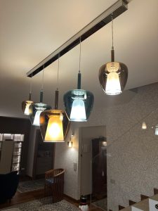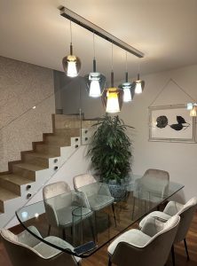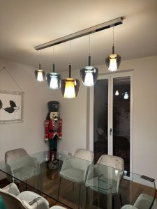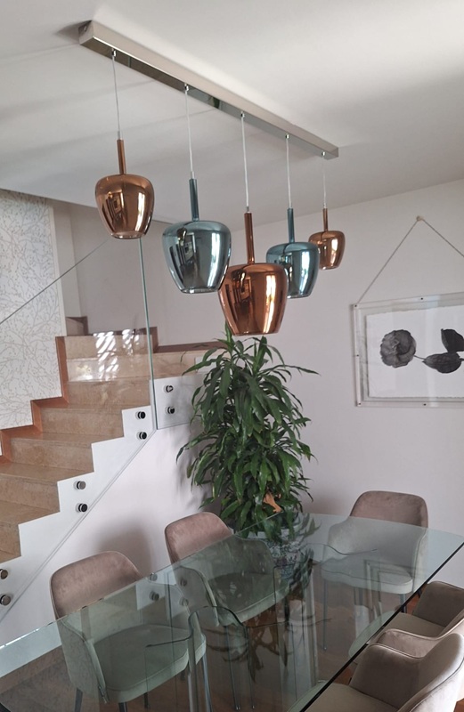 Ambientazione casa privata, zona tavolo composizione su binario da 5 sospensioni mod. Clos in vetro soffiato. Composizione con binario in metallo L.150cm. in finitura cromo lucido, sospensioni in vetro finitura bronzo metalizzato dal diametro di 18cm., in finitura verde ottanio metalizzato dal diametro di 24cm., in finitura bronzo metalizzato dal diametro di 29cm. Diffusore interno in vetro satinato, particolari in metallo cromo lucido, cavo trasparente. Diffusione luce tramite attacco a lampadina E27 led. Zona atrio, lampada da parete con struttura in cromo lucido, vetro in finitura bronzo metalizzato, diffusore interno satinato, cavo trasparente, attacco lampadine E14 led. Misure lampada da parete : diametro vetro 18cm. sporgenza 20cm. altezza max 58cm. La nuovissima collezione Clos in vetro artigianale soffiato (disponibile in diverse finiture colori vetro e diametri, nella versione singola o a composizione, anche in versione custum personalizzata) dona un’illuminazione avvolgente, perfetta per spazi conviviali, un richiamo alla tradizione e alla bellezza del vetro senza tempo. Dal design più contemporaneo, saprà valorizzare ogni ambientazione di casa o di lavoro. Design, qualità esclusuvamente Made in Italy ditta Cangini & Tucci.