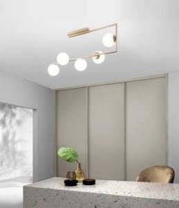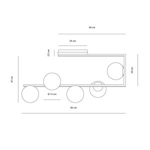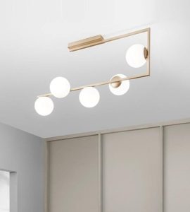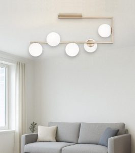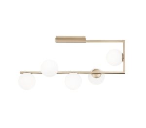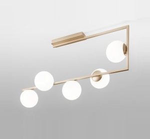Monile è una lampada da soffitto – plafoniera, realizzata con struttura in metallo nella finitura oro spazzolato, impreziosita da 5 sfere in vetro soffiato bianco satinato disposte in modo sparso. Dotata di n.5 portalampade con attacco E14 che consentono di installare lampadine a Led (lampadine escluse), scegliendo la potenza e la gradazione di luce in base alle esigenze d’illuminazione. Misure plafoniera : lato 85x30cm. H. 47cm. Dal design moderno essenziale, Monile plafoniera è ideale per arredare ed illuminare la zona soggiorno living, la zona salotto o la zona camera, in stile contemporaneo. Design, qualità Made in Italy.