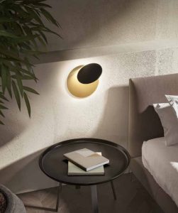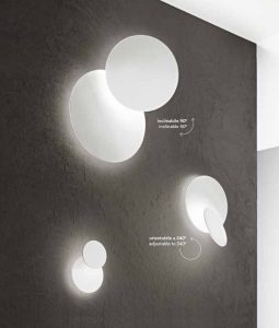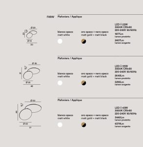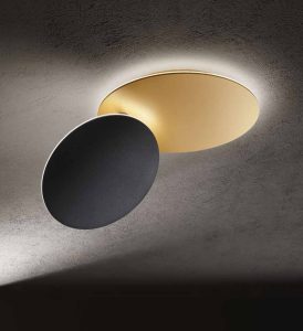 Nuova collezione di lampade installabili a parete che a soffitto a Led integrato. Struttura in metallo e alluminio verniciato a polvere, disponibile nelle finiture colori ; oro opaco/nero opaco – bianco opaco. Diffusore luce in acrilico satinato, orientabile con rotazione a 340° e inclinazione a 90°. Disponibile in tre varianti misure : diametro da 20cm. con led da 22w 3000k – diametro da 35cm. con led da 33w 3000k – diametro da 50cm. con led da 43w 3000k. Entrambi i dischi producono luce indiretta. Questa nuova lampada riesce a creare giochi di luce succestivi, tramite la rotazione del diffusore, generando un’atmosfera unica. Design contemporaneo, si accosta perfettamente ad ogni stile di arredamento, ideale per ogni spazio abitativo o di lavoro. Design, qualità a minor prezzo…. Made in Italy.