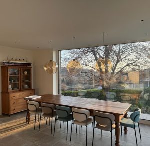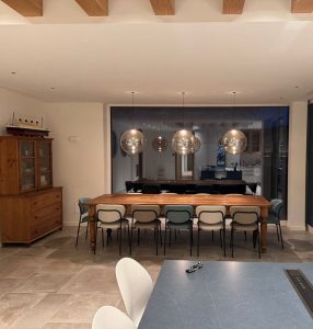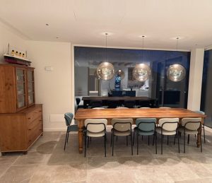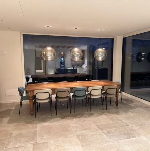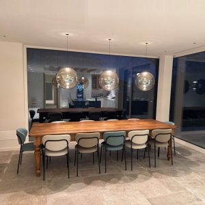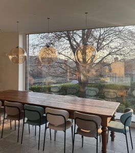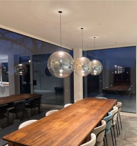 Ambientazione in casa privata, zona tavolo sospensioni a sfera mod. Pit Over in vetro soffiato/borosilicato nella finitura ambra trasparente, struttura e particolari in finitura nero opaco. Rosone custom ad incasso per soffitto in cartongesso (disponibile anche con rosone in metallo singolo e a composizione su binario o piatra per più corpi luce). Diffusione luce a led integrato da 12w 3000k 1717lm. (cob led sostituibile) driver incluso con dimmerabile Dali. Sospensione dal diametro importante di 45cm. è stata pensata per diventare il cuore pulsante del proprio ambiente. La forma rotonda e armoniosa, diffonde la luce in modo delicato ed uniforme, creando un’atmosfera accogliente. Semplicità e rafinatezza contradistingue questa sospensione, ideale per illuminare ed arredare arredamenti in stile contemporaneo. Design, qualità esclusivamente Made in Italy brand Cangini & Tucci.
