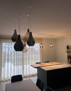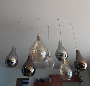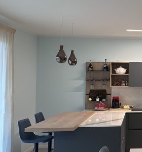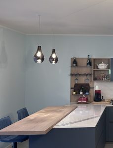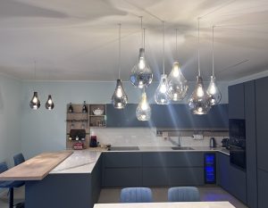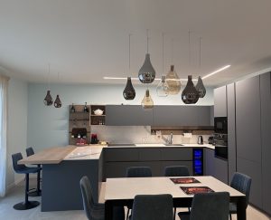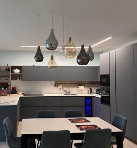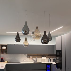 Ambientazione in casa privata, zona tavolo composizione di sospensioni in vetro pirex nelle finiture colori e misure : bronzo – ambra – trasparente – fumè nel diametro di 16cm. H.28cm. / fumè – bronzo nel diametro di 21cm. H.35cm. / ambra nel diametro di 26cm. H.42cm. Zona penisola, sospensioni in vetro pirex nella finitura vetro colore bronzo, diametro 16cm. H.28cm. Diffusione luce, diffusa ed uniforme, tramite attacco lampadina E27 Led 10w. Tutte le sospensioni sono dotate di rosone in finitura bianca da incasso per soffitto in cartongesso. (disponibile anche con rosone in metallo singolo e a composizione su binario o piatra per più corpi luce). Zona cucina, taglio di luce da incasso soffitto in cartongesso, composizione con profilo lineare da 250cm. con angolare e profilo lineare da 150cm. Strip Led da 19,2w/mt. 3000k (alimentatore a monte) diffusore opale, con effetto luce continua. Illuminazione dal design contemporaneo che si colloca perfettamente con l’attuale tendenza d’arredamento. Design, qualità Made in Italy.