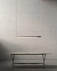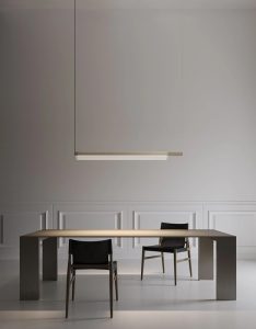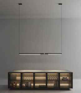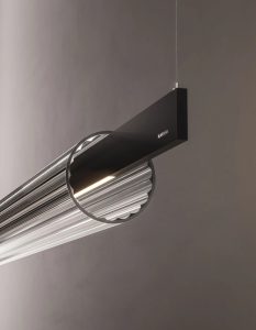 Groove è la nuova sospensione a led integrato, con struttura in alluminio anodizzato, disponibile nella finitura colore nero opaco e bronzo opaco. Diffusore cilindrico in vetro plissettato trasparente. Due varianti misure : L.140cm. led da 21w 3450lm. – L.96cm. led da 13w 2100lm. Diffusione luce indiretta, monoemissione verso il basso. Groove è l’essenza in un profilo, un segno sospeso nello spazio. La purezza di un vetro dalla superficie segnata da piccole costole longitudinali, che plasmano la luce e la riverberano, rigore assoluto vestito di raffinata luce. Minimalismo e leggerezza capaci di creare un’illuminazione elegante e contemporanea. Essenziale quanto intensa, la nuova sospensione è ideale per illuminare ed arredare la zona tavolo o un’isola – penisola della zona cucina. Design contemporaneo per un’illuminare attuale di tendenza, per ambientazioni di casa o di lavoro. Design, qualità Made in Italy brand Karman.