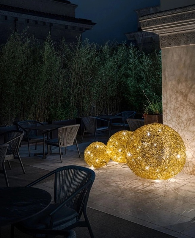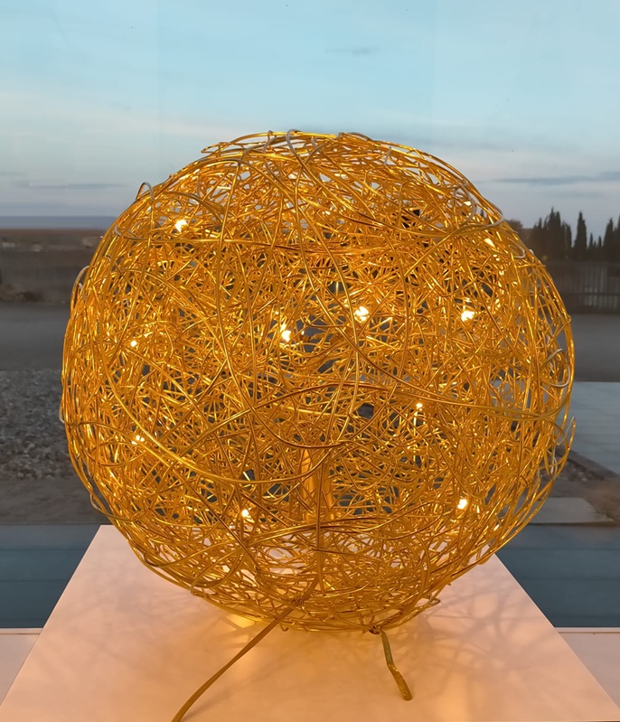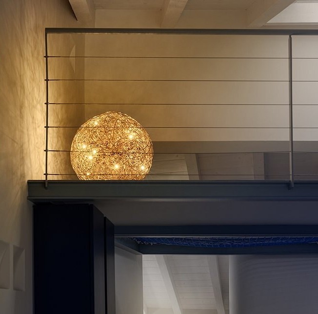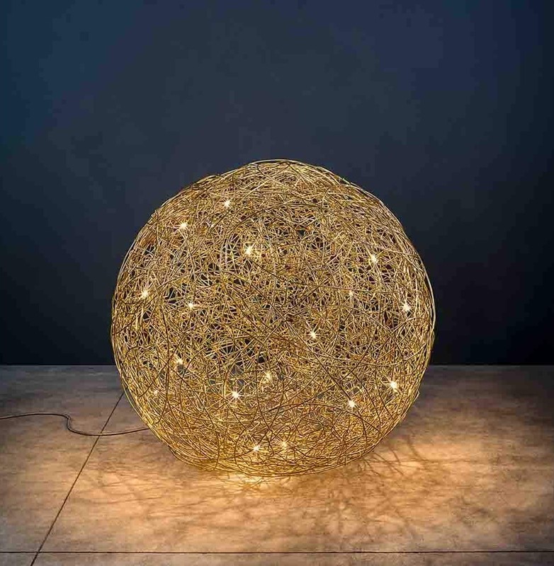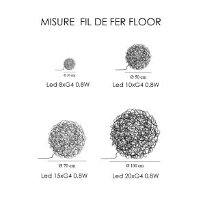Iconica lampada Fil de Fer Led terra del brand Catellani & Smith. Fil de Fer è una lampada in filo di alluminio modellato ed intrecciato a mano artigianalmente, illuminata all’interno da minuscole lampadine a Led. Diffusione luce diffusa a 360° completa di plug driver con dimmer da terra (memoria ultimo step). Disponibile in quattro diametri, da 30cm. – 50cm. – 70cm. – 100cm. Nella finitura gold (oro opaco) è una lampada di design raffinata ed elegante, che si accosta perfettamente per arredamenti sia contemporanei che classici. Fil de Fer è una lampada che non passa innossevata ne di moda, arreda ed illumina creando giochi di luce originali nell’ambiente, ideale per ogni ambientazione di casa che di lavoro. Design, artigianalità esclusivamente Made in Italy brand Catellani & Smith.