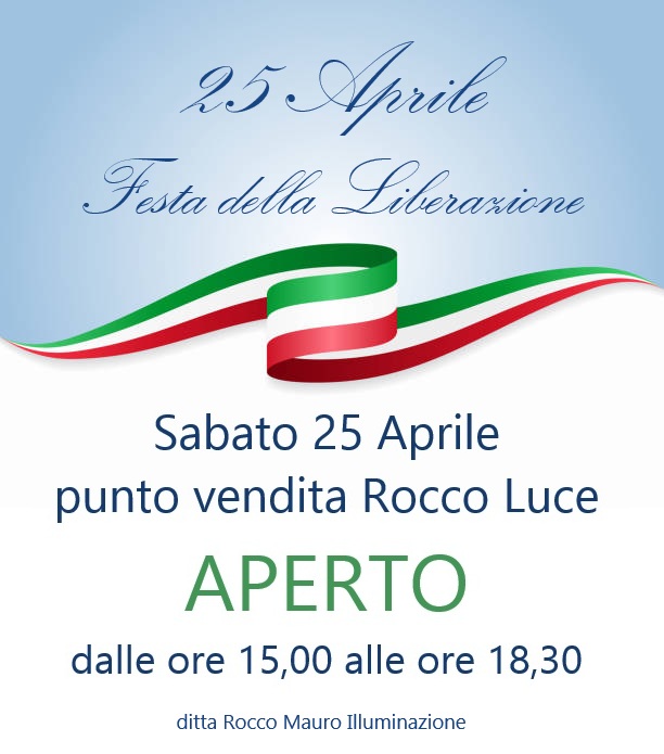 Avvisiamo la nostra spettabile clientela, che il nostro punto vendita ROCCO LUCE , nella giornata di Sabato 25 Aprile sarà aperto dalle ore 15,00 alle ore 18,30. Buon 25 Aprile….