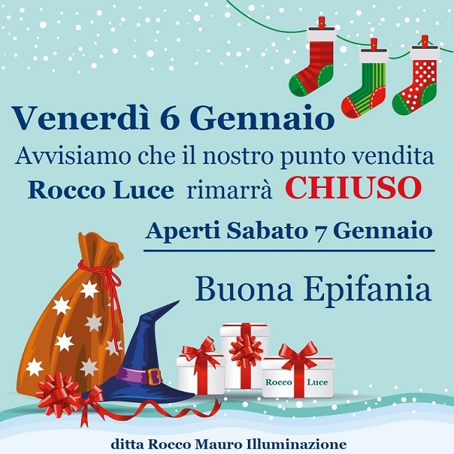 Avvisiamo la nostra clientela, che Venerdì 6 Gennaio, il nostro punto vendita Rocco Luce rimarrà chiuso per la festività dell’Epifania. Aperti Sabato 7 Gennaio. Buona Epifania….