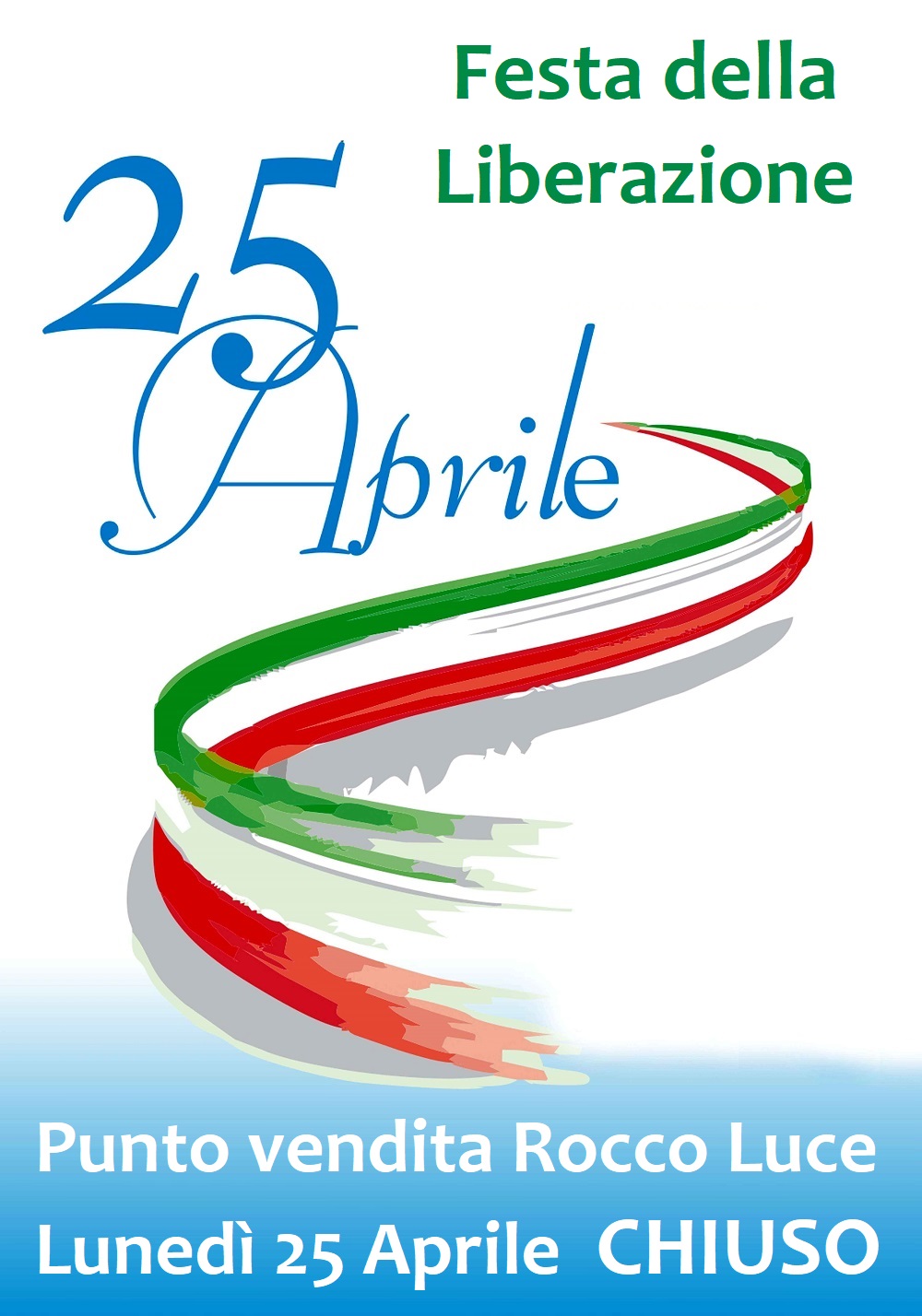 Avvisiamo la nostra clientela che nella giornata di Lunedì 25 Aprile Festa della Liberazione, il nostro punto vendita ROCCO LUCE rimarrà chiuso per la festività. Riapertura Martedì 26 Aprile.