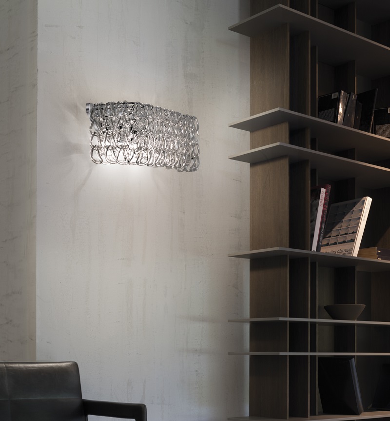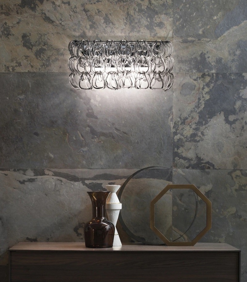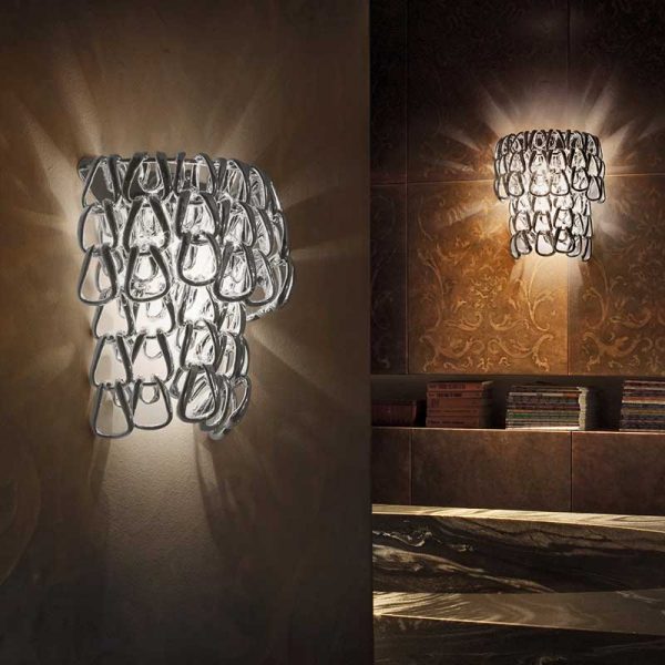 Lampada da parete Minigiogali è la versione ridotta del modello Giogali, che permette di impiegare i ganci in vetro di murano per installazioni a parete di minor dimensioni, standar o su misura. Un sistema decorativo d’illuminazione basato sull’elemento del Read more