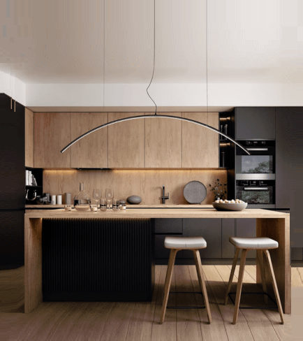 Ambientazione in casa privata, zona tavolo sospensioni a sfera mod. Pit Over in vetro soffiato/borosilicato nella finitura ambra trasparente, struttura e particolari in finitura nero opaco. Rosone custom ad incasso per soffitto in cartongesso (disponibile anche con rosone in Read more
