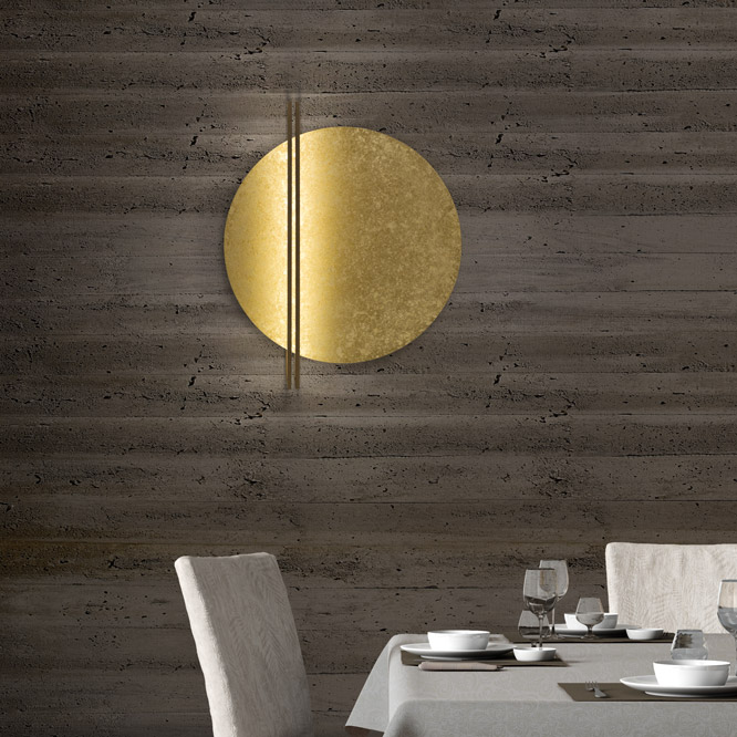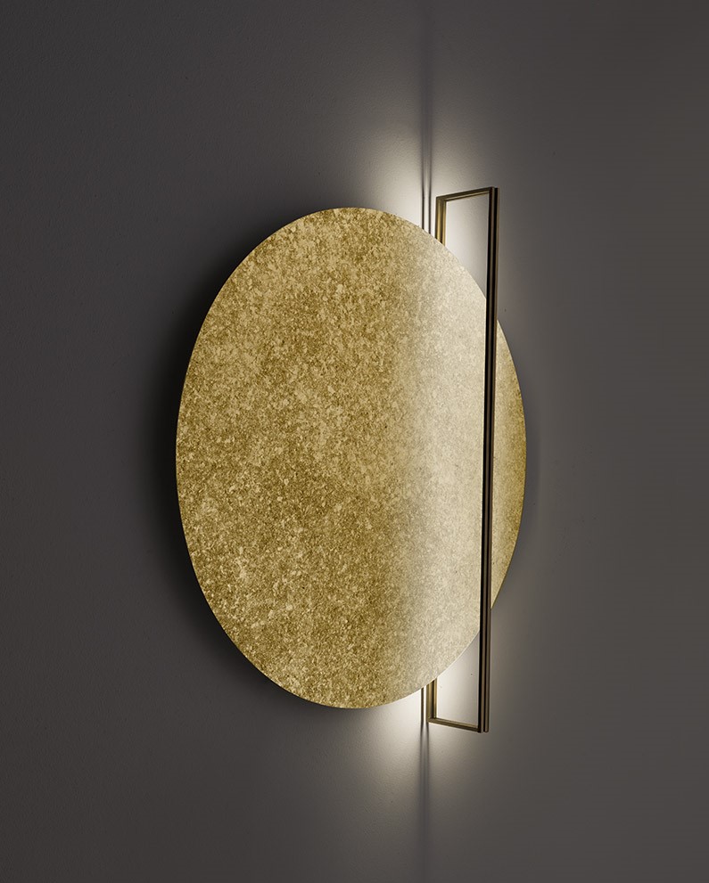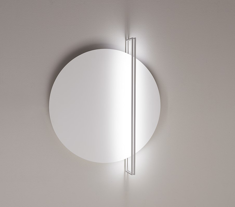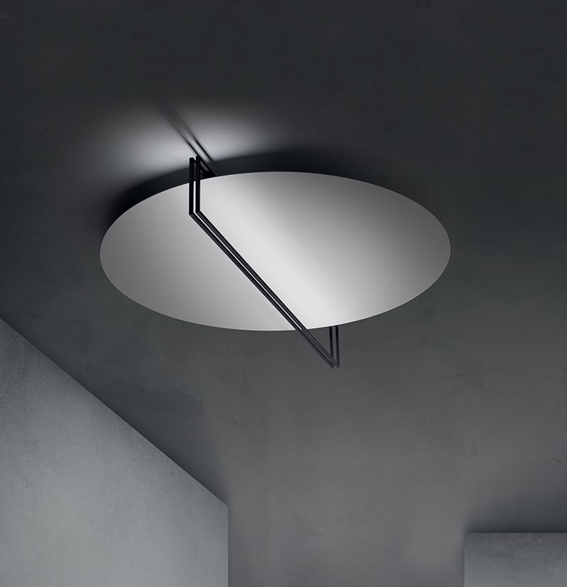Mod. Essenza Led wall – ceiling – pendant lamp. Nuova linea di articoli da illuminazione, da parete/soffitto e sospensione, realizzata da un disco riflettente in alluminio di diverse finiture sul quale viene proiettata la luce proveniente da due profiili Read more