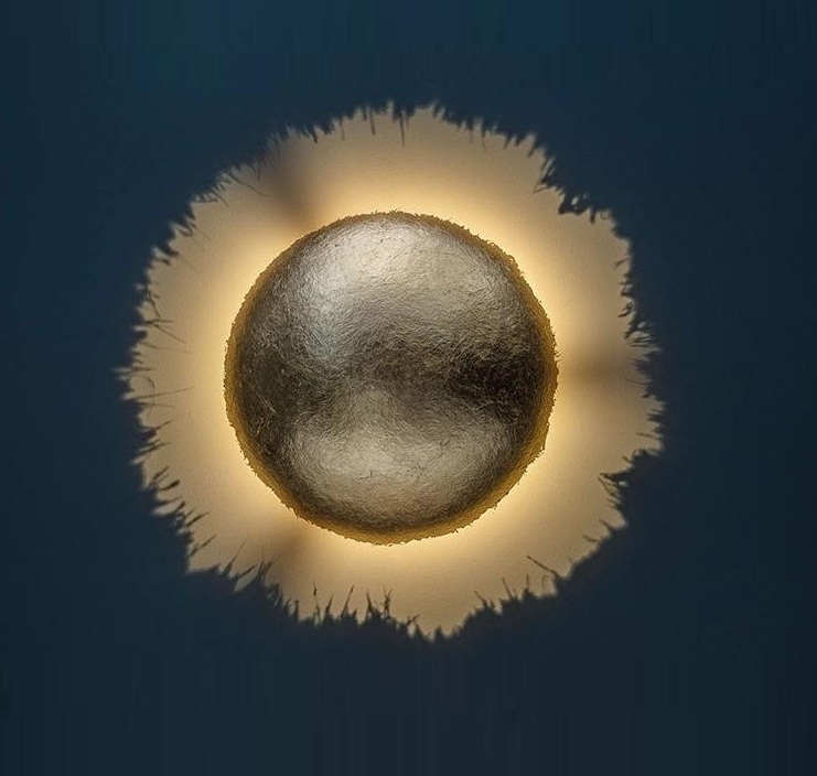 Macchina della Luce è una lampada da soffitto/sospensione formata da dischi che fungono da diffusori di luce, in alluminio rivestiti a mano artigianalmente, disponibile in foglia oro, in foglia argento e in foglia rame. Rosone in nichel (cromo lucido) Read more