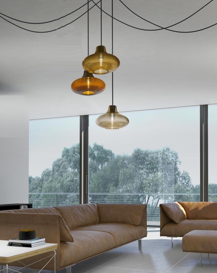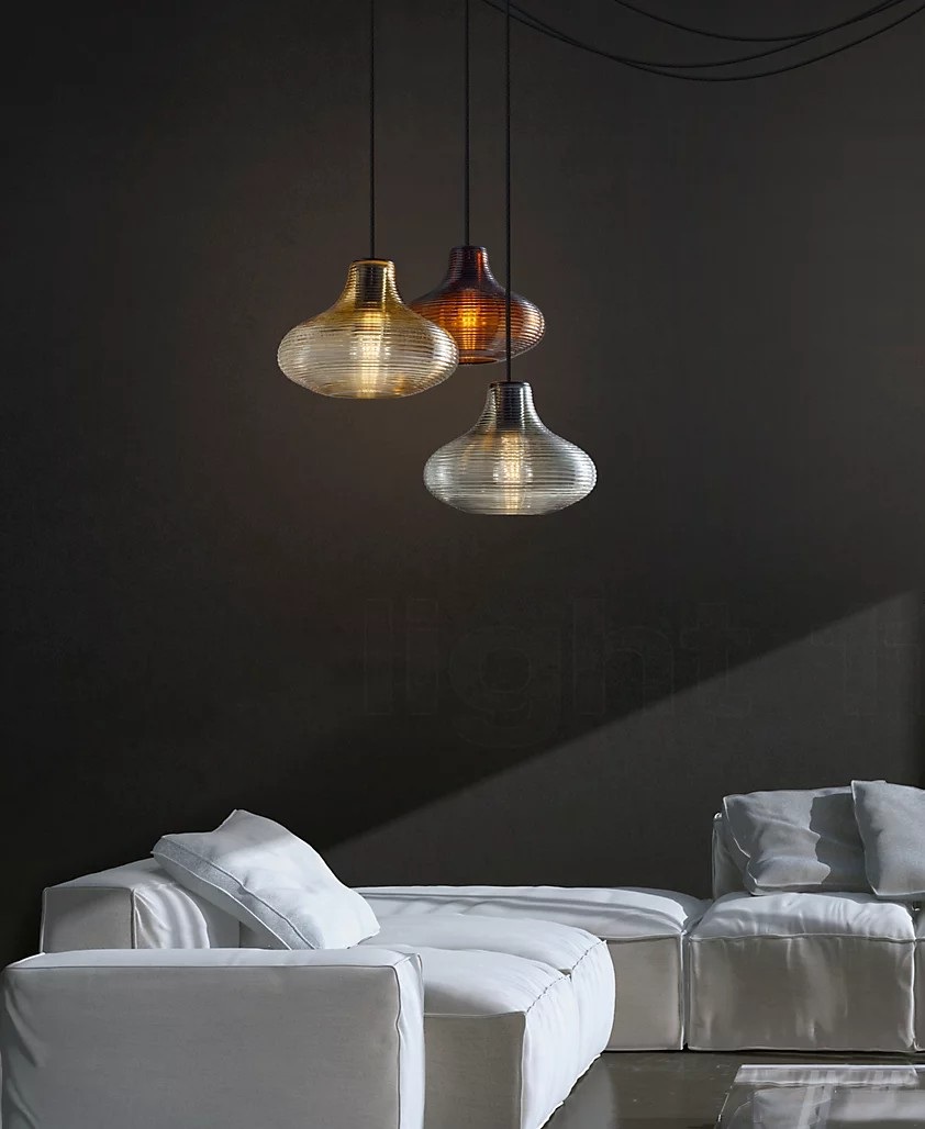 Composizione di sospensioni in vetro soffiato, con particolare finitura a coste, dal design retrò. Disponibile nella versione con finiture colore vetri : n.1 vetro ambra + n.1 vetro bronzo + n.1 vetro tabacco. Montatura e rosone in finitura nero opaco, cavo in tessuto nero da 350cm., volute in policarbonato trasparente. Diffusione luce sospensione tramite attacco lampadina led E27 (lampadine escluse). Ottima soluzione per illuminare una zona tavolo con la possibilità di decentrare e posizionare le luci dove si vuole. Ideale per arredare con eleganza ogni ambientazione di casa in stile classico contemporaneo. Design, qualità esclusivamente Made in Italy. ( ditta Panzeri )