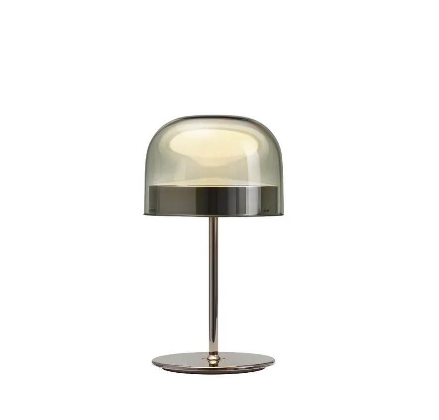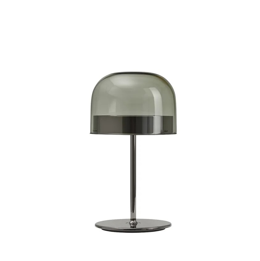 Rivisitazione della tradizionale lampada con il paralume in vetro, Equatore è una lampada da tavolo dove il flusso luminoso è prodotto da due dischi posti all’interno di una fascia di metallo centrale che vuole richiamare la linea dell’equatore. Dal design di Gabriele e Oscar Buratti per FontanaArte, nasce una lampada contemporanea e raffinata che diffonde una morbida luce verso il basso e che si irradia in maniera omogenea, riflettendosi sulla calotta di vetro. Lampada a Led integrato da 25W 2700K dimmerabile. Disponibile nella finitura cromo nero lucido e vetro fume’. Design, qualità esclusivamente Made in Italy. ( ditta Fontana Arte)