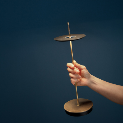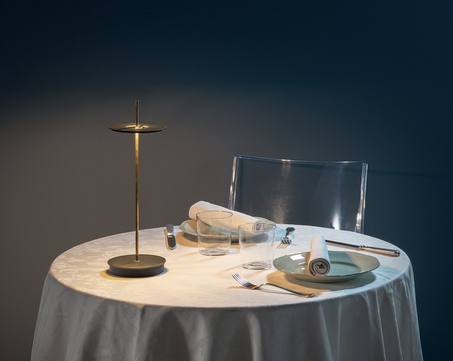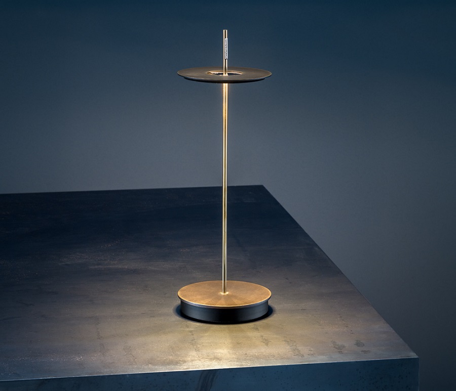 Lampada da tavolo ricaricabile con finitura base ed anello in ottone vintage e asta ottone. Fonte luminosa a Led 1×2,8W 5V, lumen 283 K 2700°, alimentazione a batteria Li-iON 3,7V 4100 mAh caricatore input 110/240V output 5SV@1,2 A, con touch dimmer. Disponibile, la personalizzazione con incisione a laser sulla base della lampada Giulietta, del logo della propria attivita. Grazie al funzionamento a batteria e all’assenza di cavi, la nuova Giulietta BE T table led battery può essere ‘trasportata’ con estrema facilità in qualsiasi ambiente. Con il semplice tocco della mano è possibile accenderla ed ottenere tre diverse intensità luminose. Giulietta BE T è composta da una sottile asta che ha origine da una base circolare e da un cerchio che le gravita intorno, all’apparenza senza alcun sostegno. La presenza del cerchio che nasconde la fonte luminosa è elemento distintivo della lampada Giulietta. Design, qualità ed innovazione led, esclusivamente Made in Italty. (ditta Catellani&Smith)