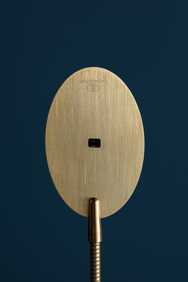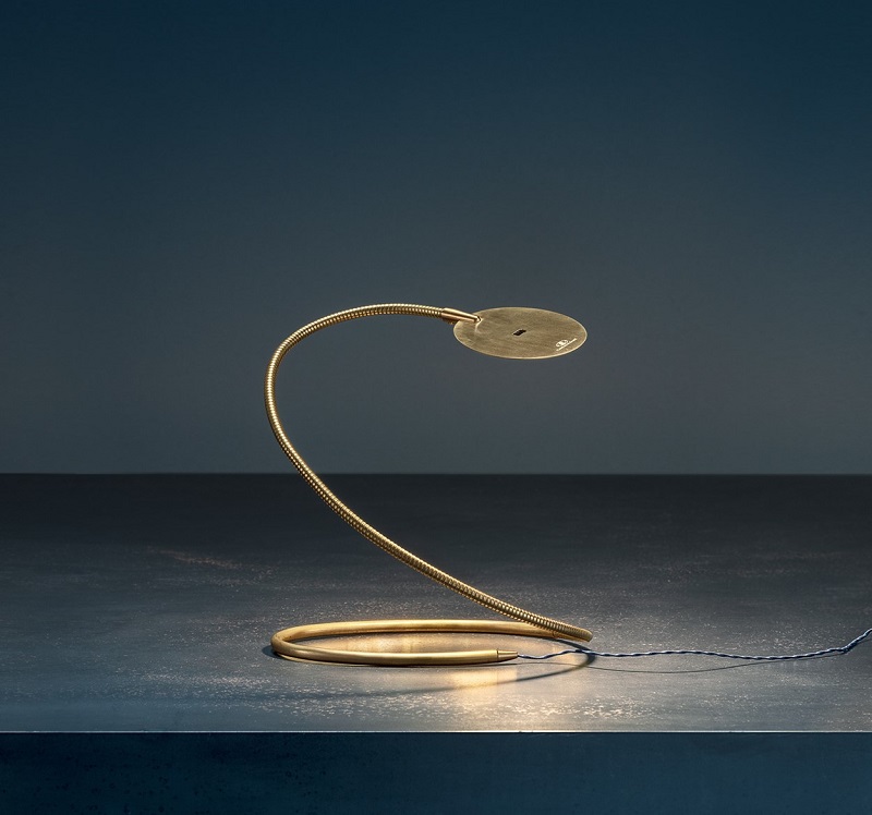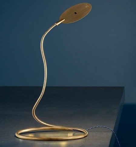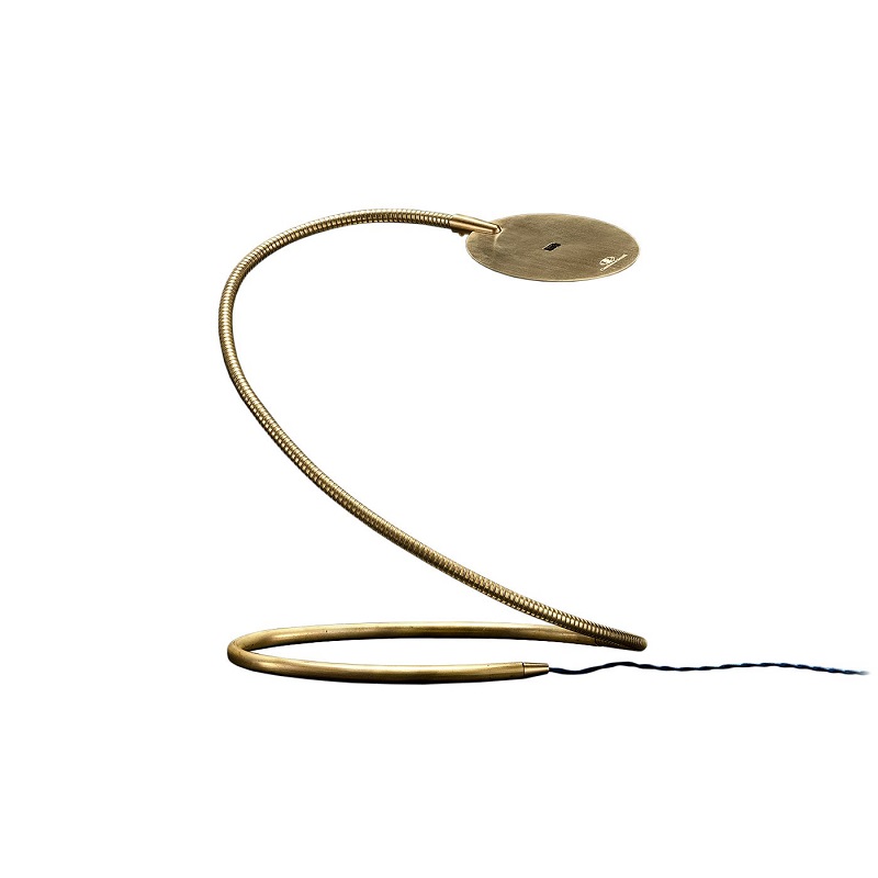 Realizzata interamente in ottone naturale, la sinuosa lampada Herem è caratterizzata da una base rigida da cui nasce un flex modellabile, che sostiene una sottile piastra ovale dove è nascosta una LED board con touch-less dimmer. Lampada dimmerabile touch con 3 variazione di intensità luce e spegnimento. LED board 1×2,2W 5V @1,2A 3000K lumen 100, alimentatore 110-240V USB con spina EU. Lampada completa di cavo con USB e spina. Design, qualità ed innovazione led, esclusivamente Made in Italty. (ditta Catellani&Smith)