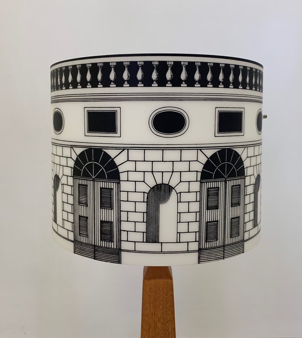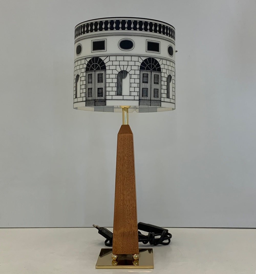 Lampada da tavolo realizzata dal designer Piero Fornasetti per il brand Antonangeli. Lampada con base in ferro dorato, fusto in legno a forma di obelisco e paralume con disegni architetture in polipropilene. Sorgente luminosa tramite attacco lampadina 1xE14 led (lampadina non inclusa). Lampada da tavolo senza tempo dalla creatività del designer Fornasetti. Design, qualità Made in Italy. ( Fornasetti – Antonangeli )